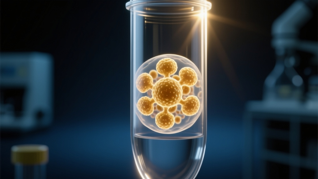 A transparent biochemical assay vial containing a microscopic cluster of lab-grown pancreatic cells, captured in exact symmetrical centeredđ· Photo by Tech&Space